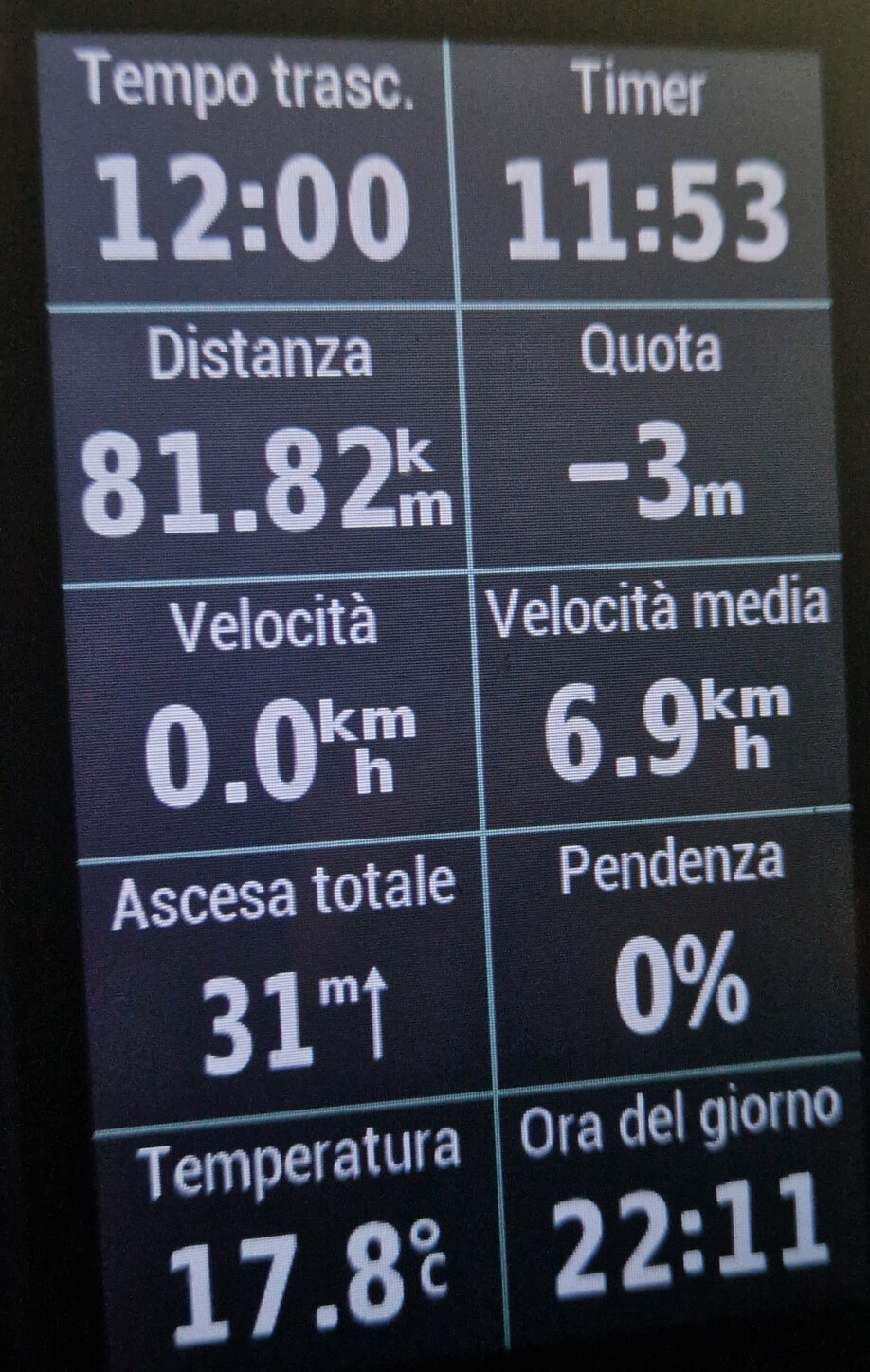 i Poi ho avuto un calo sulle medie e sui tempi di pausa, ma le pause sono state più che altro per fare le foto ed accendere e spegnere le videocamere, ogni ora facevo una foto con il mio telefono e ogni 6 ore un video, comunque a 12 ore fatte la media era di 6,9 km/h alle 22:11 con 81,82 km. Allo scoccare delle 12 ore sono partiti anche altri corridori e staffettisti delle 12 ore.