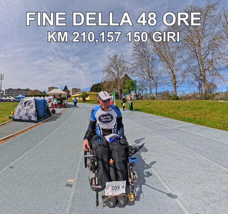 Questo è il risultato della mia ultima Super IMPRESA/SFIDA alla 48 ORE al Cinisello Balsamo Running Festival del 27-28-29 marzo 2026. La gara si svolgeva su un percorso di 1,4 km che si doveva ripetere per 48 ore, naturalmente ognuno poi si gestiva il tempo nelle 48 ore disponibili e poteva anche fermarsi e ricominciare quando voleva, certe persone si sono portate anche la tenda ed i letti, dormivano e poi ripartivano. Io non ho mai dormito e le pause di circa 3 ore sono state ai ristori e alla mia “postazione” dove avevo le mie provviste e vestiario, un po’ di tempo l’ho perso anche per la videocamera e per motivi fisiologici. Le tre giornate sono state fortunatamente senza pioggia ma con un clima molto variabile, la prima notte di venerdì il termometro è sceso a meno uno e dalle 12 alle 24 c’era anche il vento, la seconda notte invece la temperatura di notte è stata circa sui 7 gradi. Durante il giorno dei tre giorni la temperatura è stata buona sui 15/18 gradi e il vento fortunatamente del primo giorno nel secondo e terzo giorno si è attenuato, quasi nullo. Alla fine delle 48 ORE ho fatto 210 km. Per me il percorso non era molto veloce, ogni giro di 1,4 km la salita attiva era di 3,1 metri, alla fine io che ho fatto 150 giri ho fatto 465 metri di ascesa, si alzava di 1 metro nella prima parte usciti dalla pista di atletica e poi di 2 metri nella parte finale prima dell’entrata del Centro Sportivo. Poi altro svantaggio per me i diversi cambi di direzione, le pendenze laterali e asfalto a dossi sempre sul percorso esterno, dove dovevo continuamente correggere la direzione della carrozzina, le ruote anteriori tendono a seguire la direzione della strada e per andare diritto o seguire la strada devo lavorare moltissimo con le dita sui due volani che ho sul lato destro, dove spingo e gestisco le due ruote della carrozzina. Ricordo che io uso una carrozzina monoguida che spingo e gestisco con un braccio solo e ricordo anche che è molto diversa la gestione da una carrozzina normale.