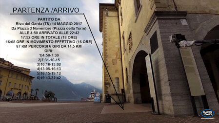 Al sesto giro ho avuto più problemi di pause per motivi miei fisiologici, oltre agli ormai noti del video, che dovevo accendere e spegnere manualmente la gopro. Ma ormai sapendo che sarei arrivato prima delle 18 ore, ho calato l’intensità nella fase finale di ritorno da Arco/Riva. Il mio obiettivo delle 15 ore lo avevo già ottenuto, anzi ero andato oltre. Il tempo all’arrivo è stato di 16:08 ore in MOVIMENTO EFFETTIVO e 17:52 in TOTALE e 87,5 km. Se sommo anche il pre e dopo IMPRESA, sono stato in giro dalle 4:30 alle 23:30 19 ore, ed ho superato i 90 km, se aggiungo i 3 km per recarmi alla partenza e ritornare a casa.