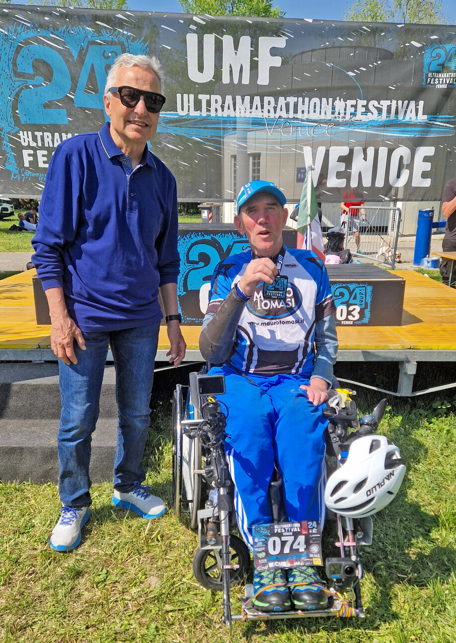 Il 13 e 14 aprile 2024 ho gareggiato e portato a termine una 24 ore UFFICIALE con la mia carrozzina monoguida che spingo con un braccio solo. Sono stato alla UMF Ultramarathon Festival Venice a Venezia (VE), si correva su un percorso di 1,38 km nel mezzo del Parco di San Giuliano, io ho fatto 103 giri e 144,4 km in 24 ore. Siamo partiti alle 10:11 di sabato ed abbiamo finito alle 10:11 di domenica. In carrozzina ero solo io e sinceramente non ho mai sentito nessuno nemmeno con le due braccia che abbia fatto una 24 ore ufficiale.