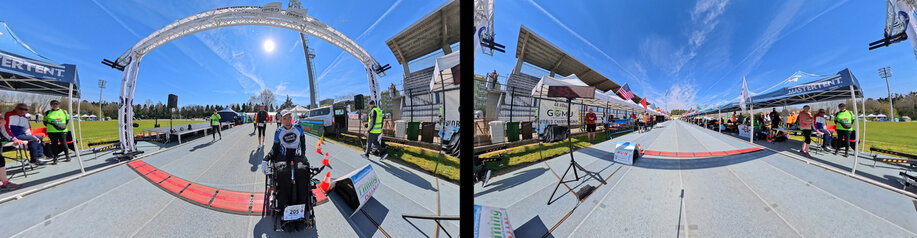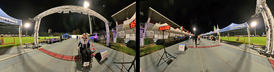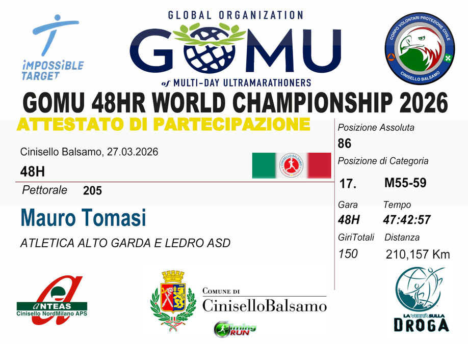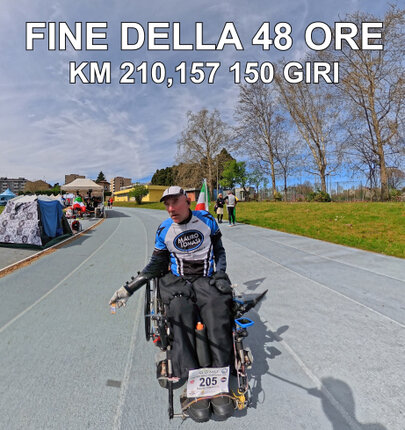 Questo è il risultato della mia ultima Super IMPRESA/SFIDA alla 48 ORE al Cinisello Balsamo Running Festival del 27-28-29 marzo 2026. La gara si svolgeva su un percorso di 1,4 km che si doveva ripetere per 48 ore, naturalmente ognuno poi si gestiva il tempo nelle 48 ore disponibili e poteva anche fermarsi e ricominciare quando voleva, certe persone si sono portate anche la tenda ed i letti, dormivano e poi ripartivano. Io non ho mai dormito e le pause di circa 3 ore sono state ai ristori e alla mia “postazione” dove avevo le mie provviste e vestiario, un po’ di tempo l’ho perso anche per la videocamera e per motivi fisiologici. Le tre giornate sono state fortunatamente senza pioggia ma con un clima molto variabile, la prima notte di venerdì il termometro è sceso a meno uno e dalle 12 alle 24 c’era anche il vento, la seconda notte invece la temperatura di notte è stata circa sui 7 gradi. Durante il giorno dei tre giorni la temperatura è stata buona sui 15/18 gradi e il vento fortunatamente del primo giorno nel secondo e terzo giorno si è attenuato, quasi nullo. Alla fine delle 48 ORE ho fatto 210 km. Per me il percorso non era molto veloce, ogni giro di 1,4 km la salita attiva era di 3,1 metri, alla fine io che ho fatto 150 giri ho fatto 465 metri di ascesa, si alzava di 1 metro nella prima parte usciti dalla pista di atletica e poi di 2 metri nella parte finale prima dell’entrata del Centro Sportivo. Poi altro svantaggio per me i diversi cambi di direzione, le pendenze laterali e asfalto a dossi sempre sul percorso esterno, dove dovevo continuamente correggere la direzione della carrozzina, le ruote anteriori tendono a seguire la direzione della strada e per andare diritto o seguire la strada devo lavorare moltissimo con le dita sui due volani che ho sul lato destro, dove spingo e gestisco le due ruote della carrozzina. Ricordo che io uso una carrozzina monoguida che spingo e gestisco con un braccio solo e ricordo anche che è molto diversa la gestione da una carrozzina normale.