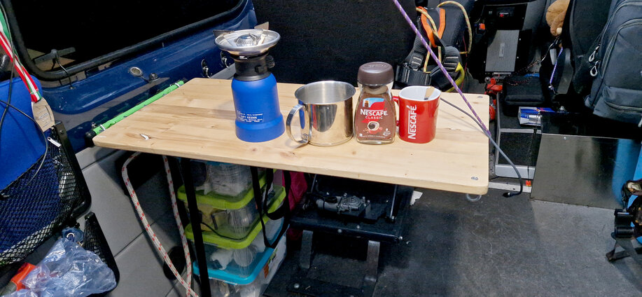 Alle 6 mi sono “svegliato” fatto colazione e preparato, ho inventato anche un tavolino scorrevole con una corda che posso usare quando mi serve e toglierlo anche facilmente tirando la corda, lo spazio all’interno del furgone per me in carrozzina è molto limitato ed ho dovuto ottimizzarlo al massimo, ho anche un fornello da camping per scaldare l’acqua per il caffe/cappuccio, pentolino, tazze, brioches e anche biscotti in vari scomparti di plastica.